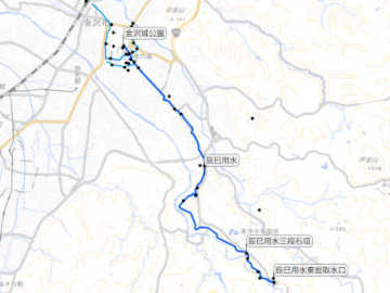 辰巳用水は、兼六坂上で分流し、成巽閣や国立工芸館の前を流れて、美術の小径横を滝のように落ちていきます。その後、21世紀美術館横の金沢城西外惣構として流れ、鞍月用水と合流しています。
